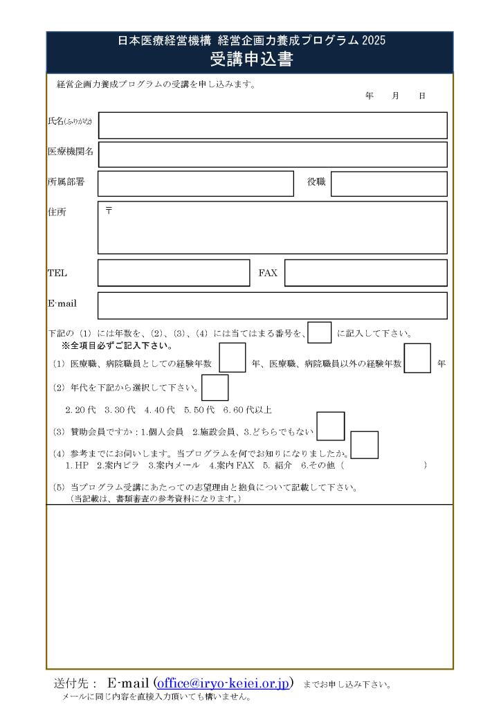ご記入の上、E-mail:office[at]iryo-keiei.or.jp (atは@に置き換えてください)までお送りください。