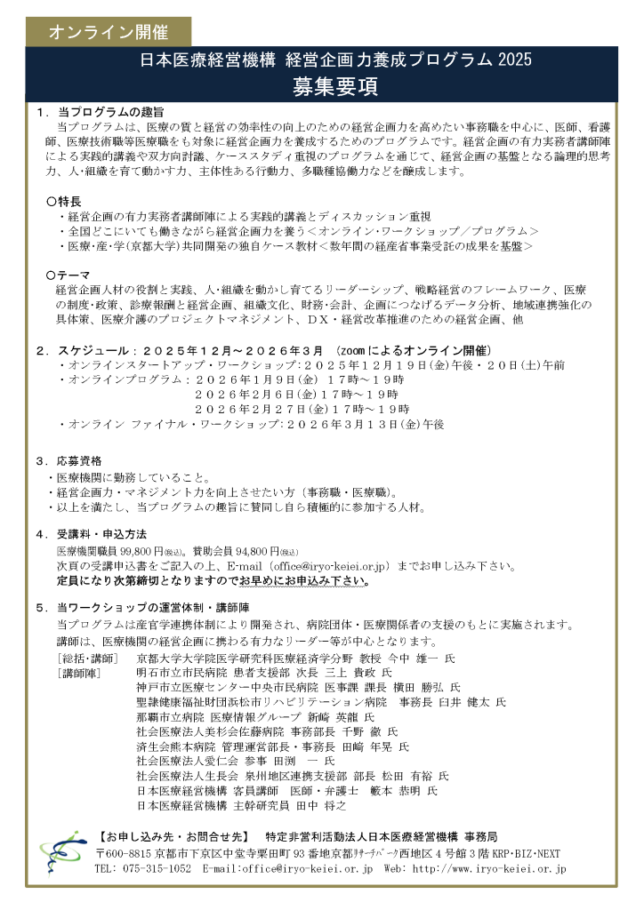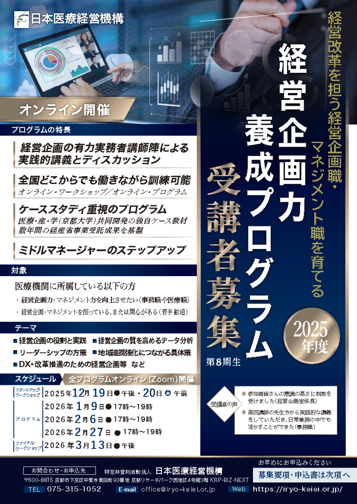 日本医療経営機構は、医療機関職員の方々を対象に、極めて厳しい医療環境における経営改革推進に向けて、経営企画職・マネジメント職・中間管理職を養成する経営企画力養成プログラム2025の参加者募集を開